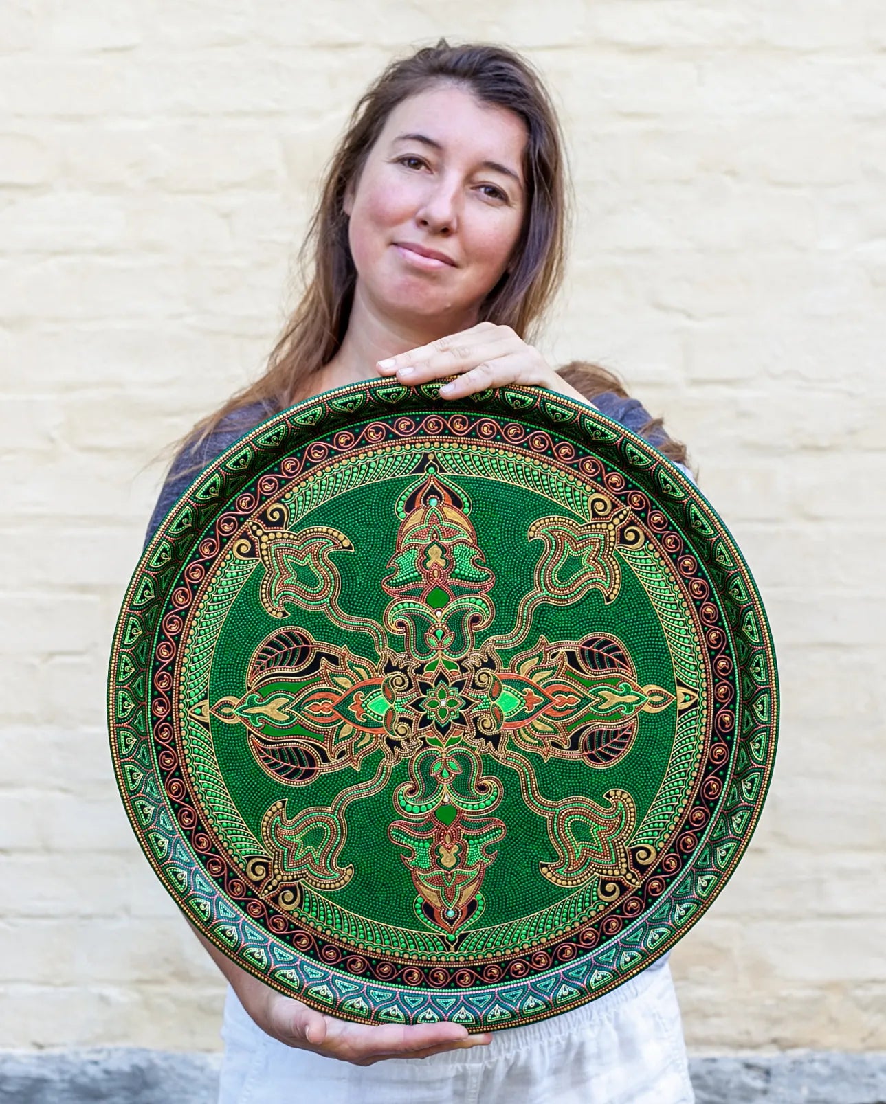 Through intricate patterns built from dots and fine graphic lines, she develops a distinctive visual language described as Symbolic Pointillism. Ethnic ornaments, botanical motifs, and decorative forms come together in intricate patterns that reinterpret cultural symbols in a contemporary way.