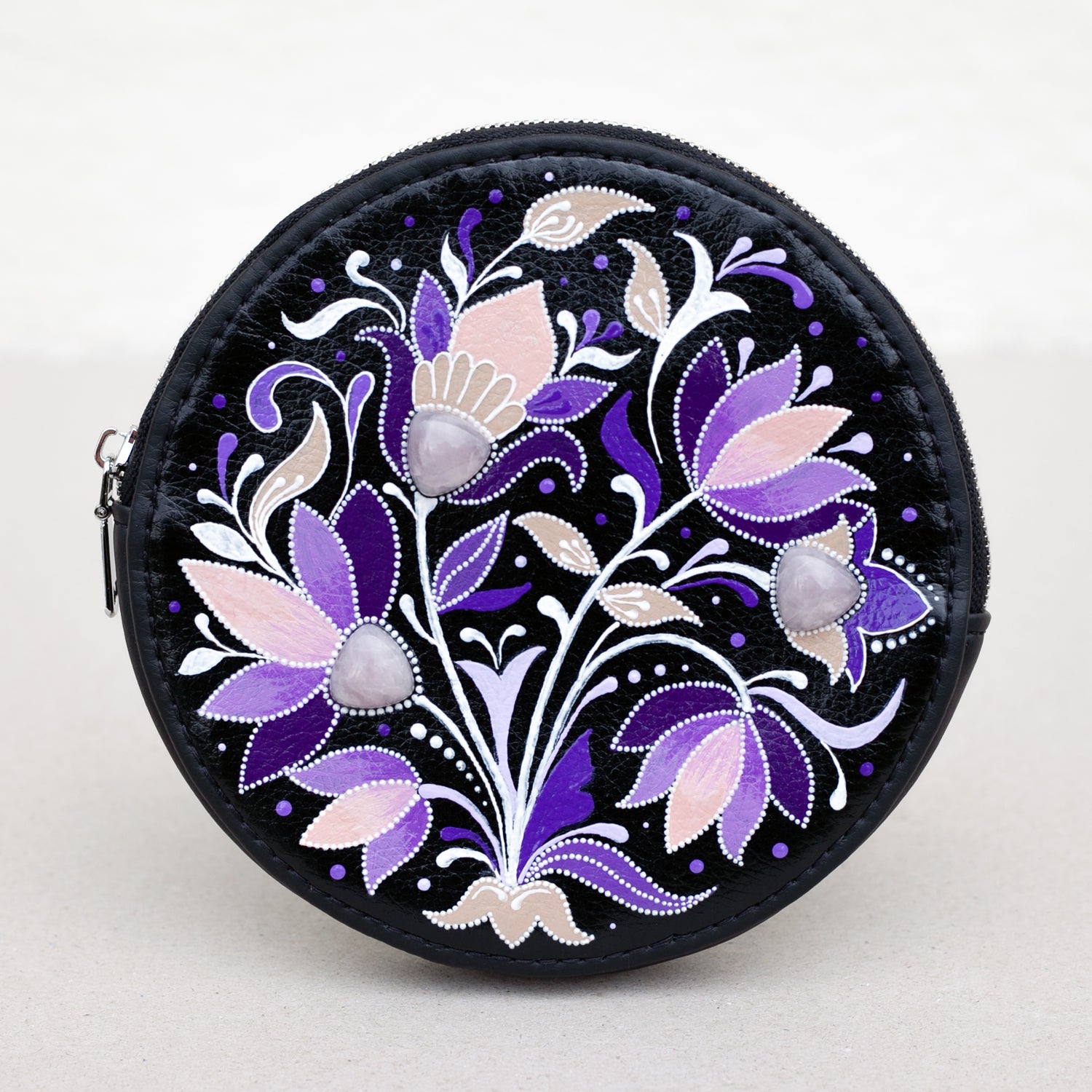 Ce portefeuille rond est fabriqué en similicuir végétalien de première qualité. Il est orné d'un motif floral peint à la main en violet et en rose et de petites pierres de quartz rose.
