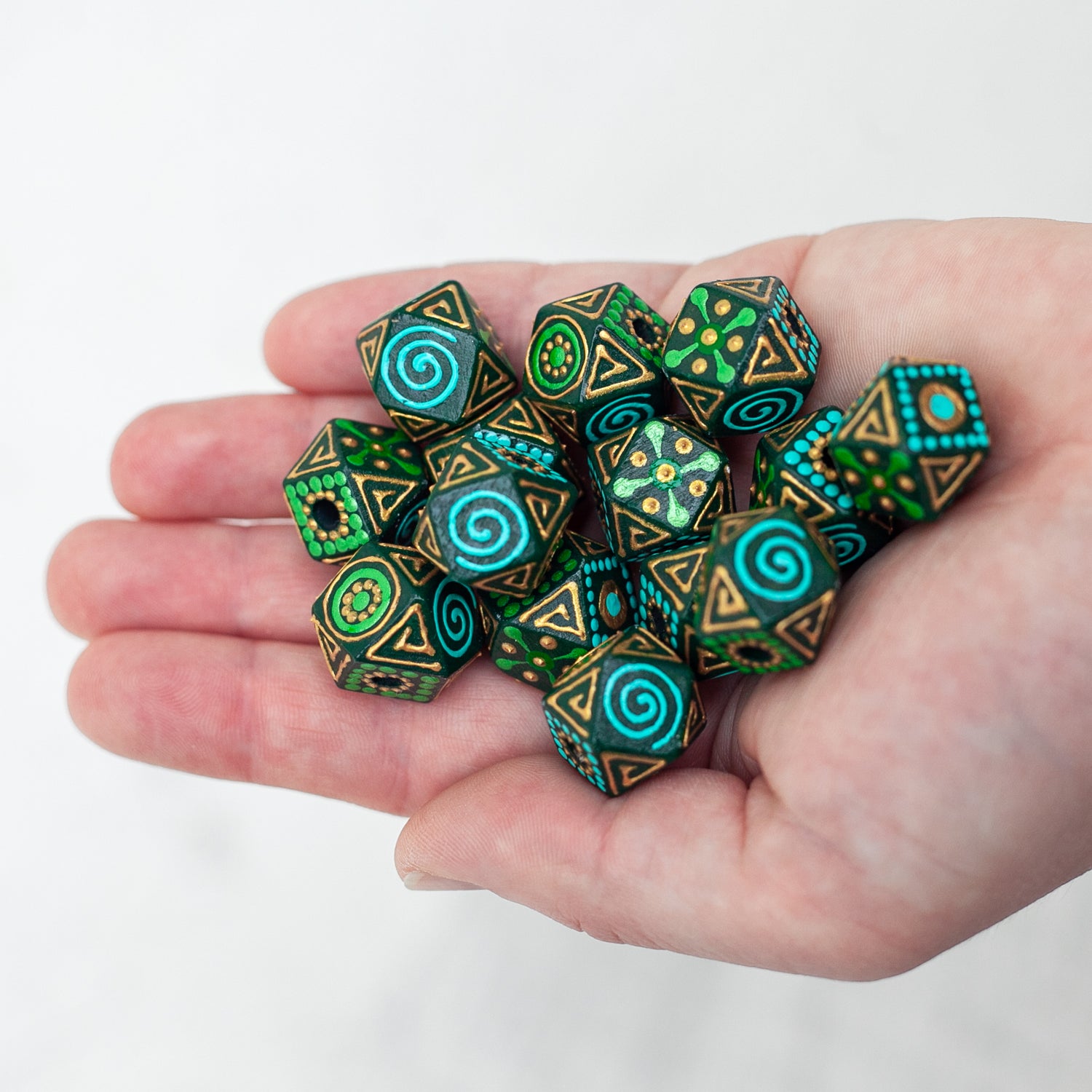 Ces perles hexagonales en bois sont fabriquées à partir de bois naturel et peintes à la main avec des motifs ethniques verts et dorés. Leur forme géométrique unique les rend parfaites pour la fabrication de bijoux et divers projets d'artisanat.