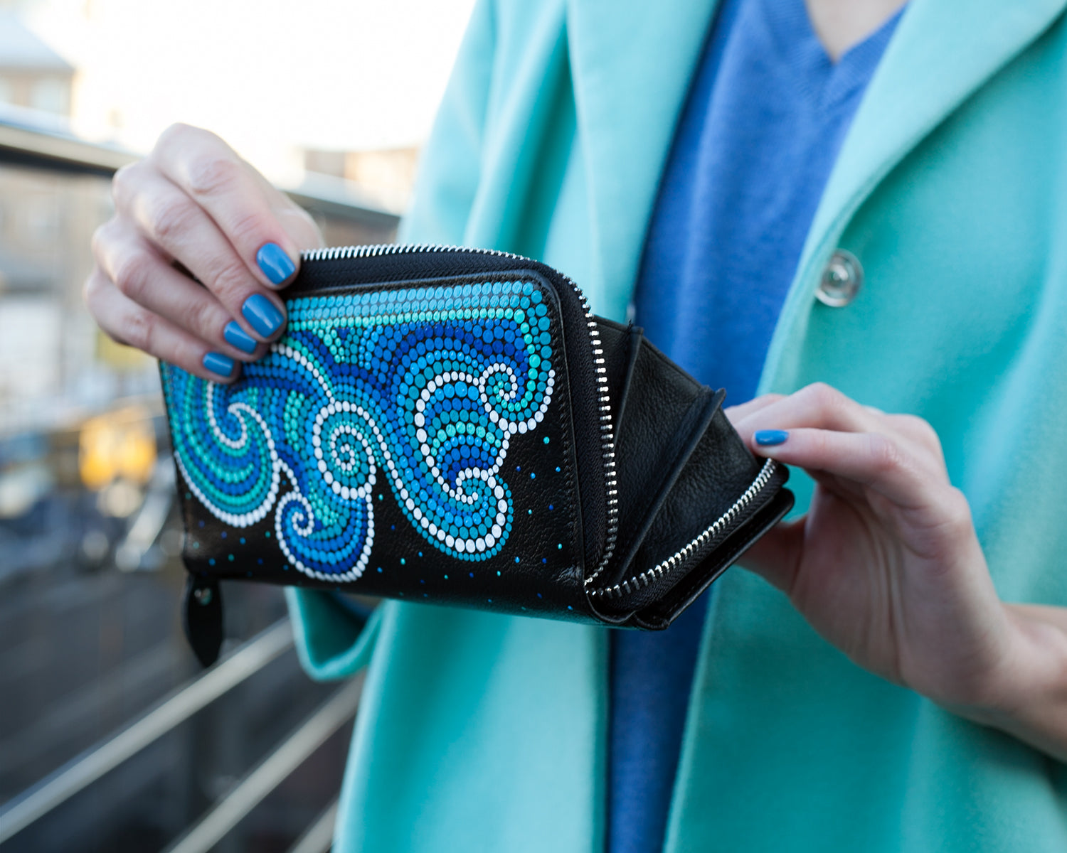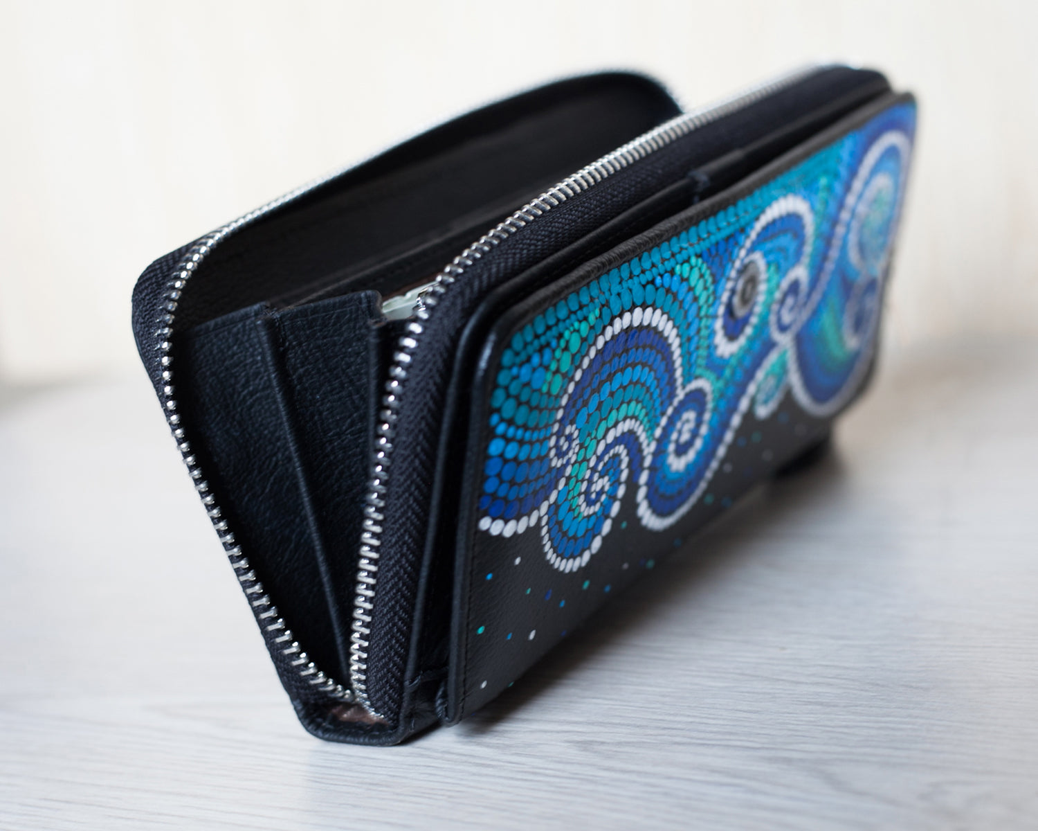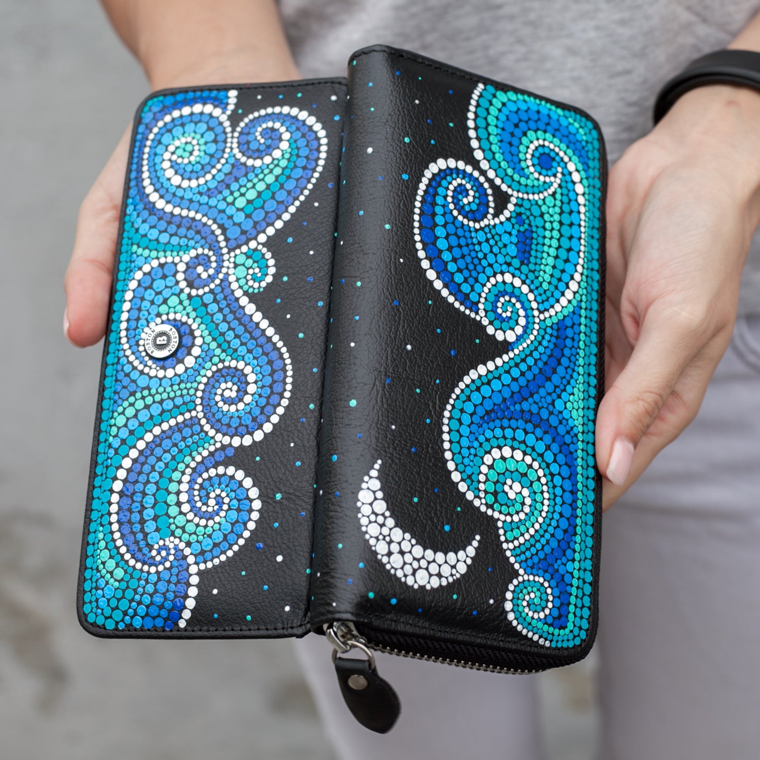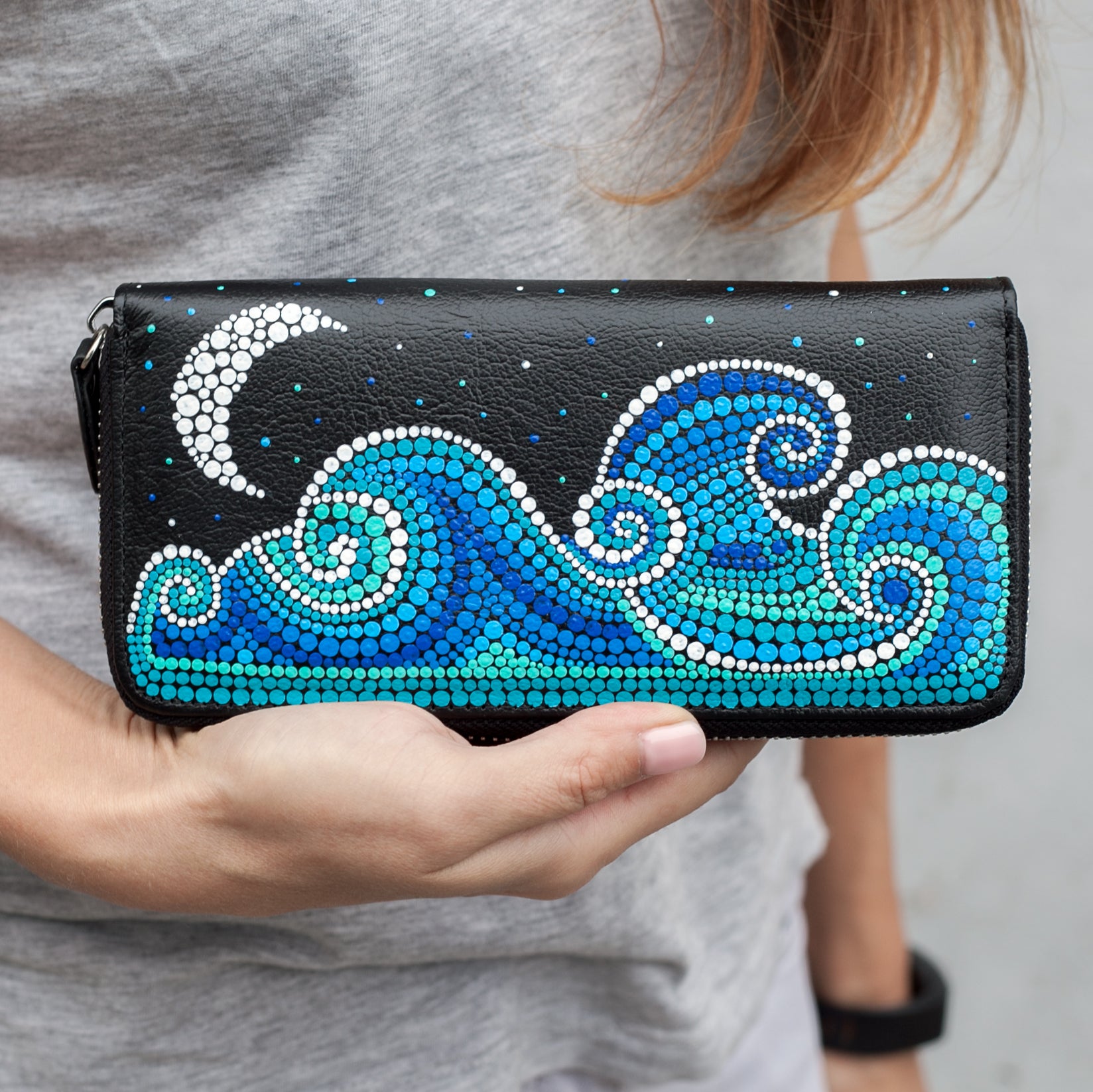 Ce portefeuille zippé multifonction est fabriqué en cuir véritable noir et peint à la main avec des vagues bleues et un motif de lune.