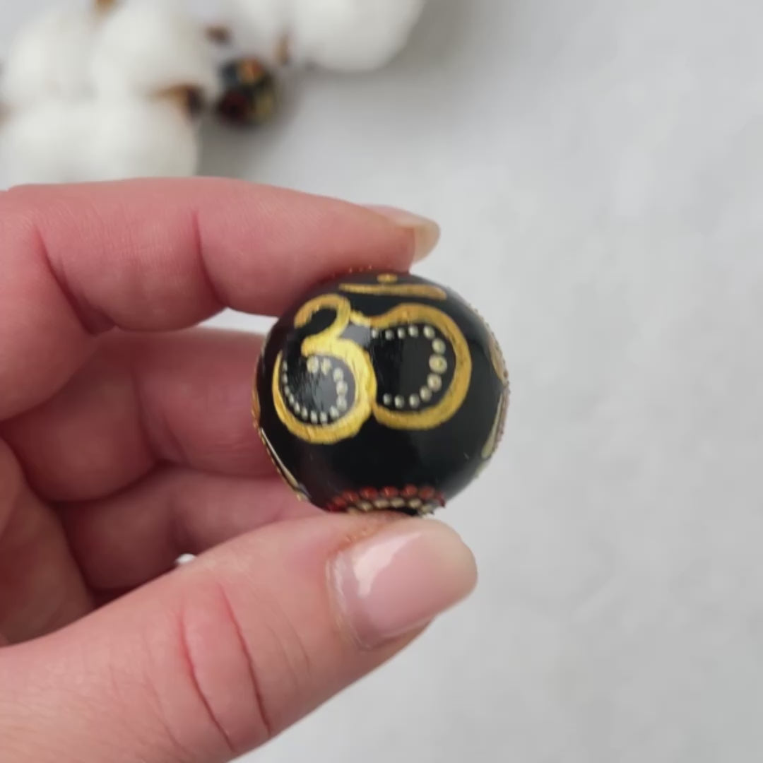 Ajoutez une touche spirituelle à vos créations avec ces perles rondes peintes à la main et représentant le symbole sacré Om (Aum). Fabriquées en bois naturel de haute qualité, elles sont peintes en or et en cuivre et recouvertes d'un vernis protecteur.