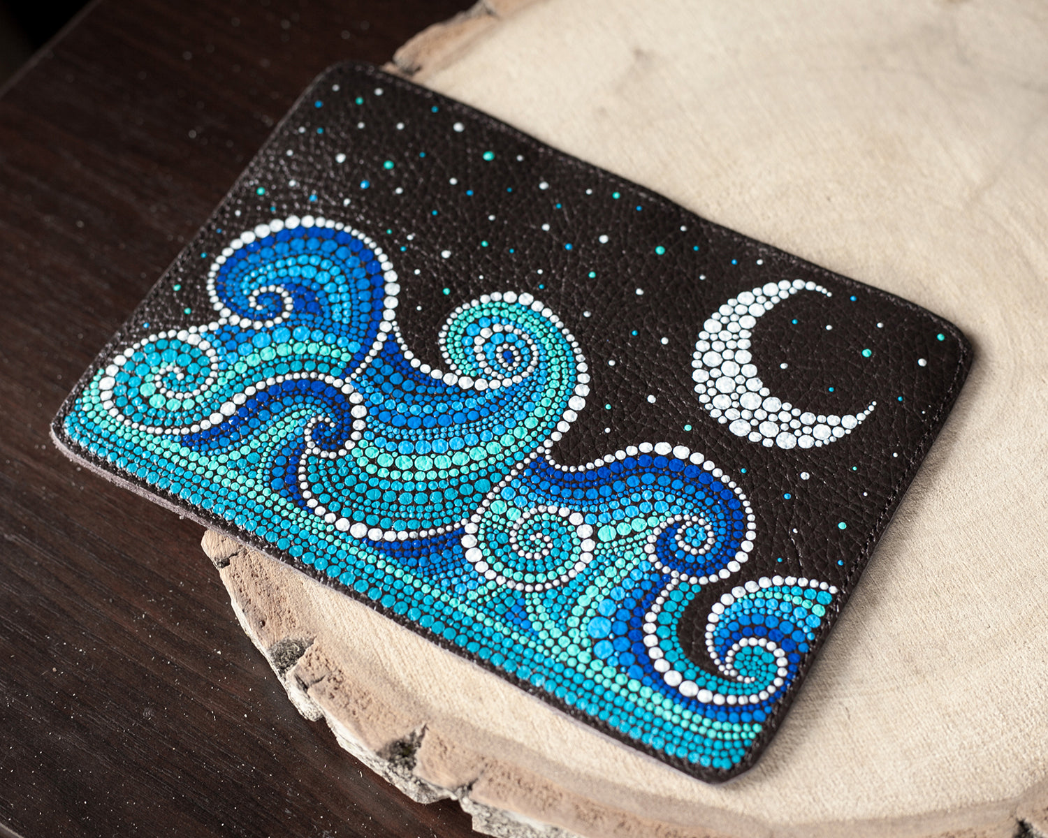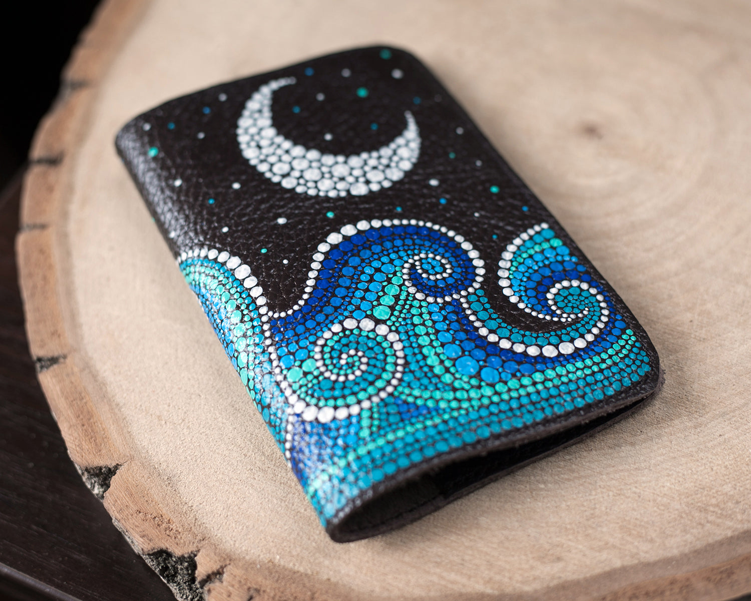 Fabriqué en cuir véritable noir, cet étui à passeport présente un design unique peint à la main de vagues bleues et d'une lune dans la technique originale du dot art. C'est un cadeau parfait pour toutes les occasions, alliant personnalisation et praticité pour un document que vous utilisez fréquemment au quotidien. Grâce à ses matériaux de haute qualité et à son savoir-faire, cet étui à passeport servira son propriétaire de manière fiable pendant de nombreuses années.