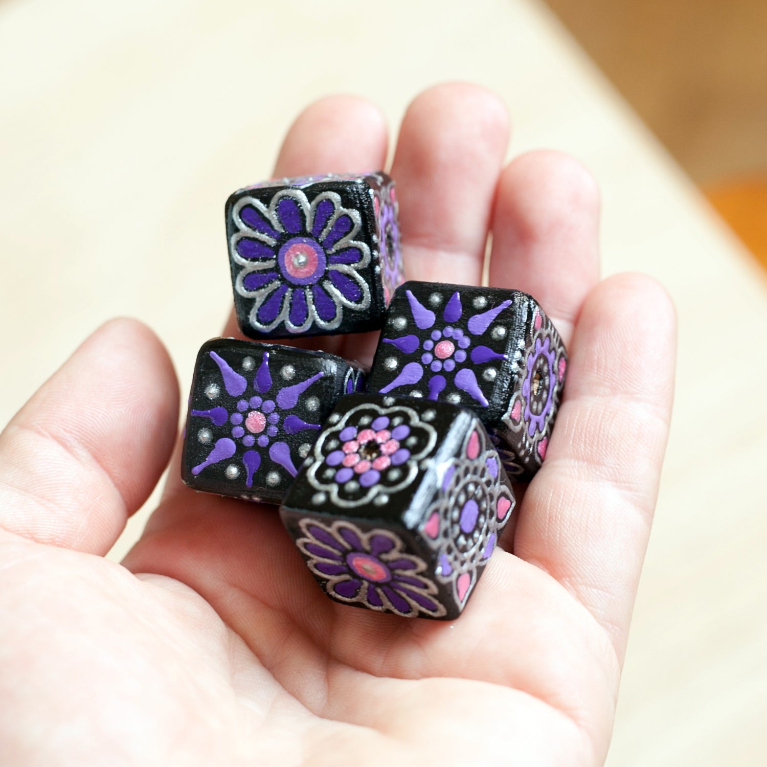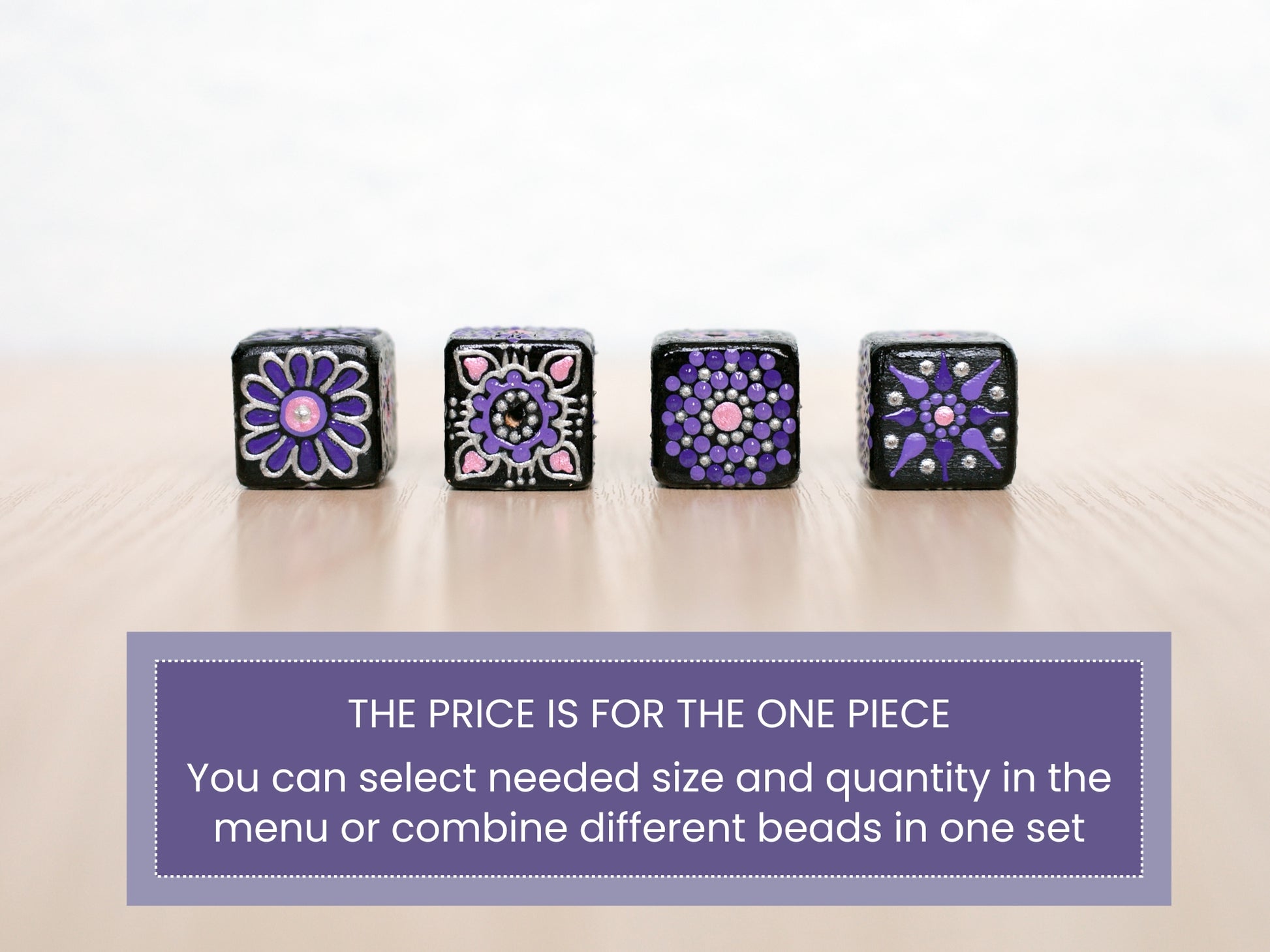 Ces perles cubiques en bois sont fabriquées à partir de bois naturel et peintes à la main avec des motifs floraux violets, roses et argentés. Ces perles uniques présentent une forme géométrique originale, ce qui les rend idéales pour vos projets de fabrication de bijoux et d'artisanat.