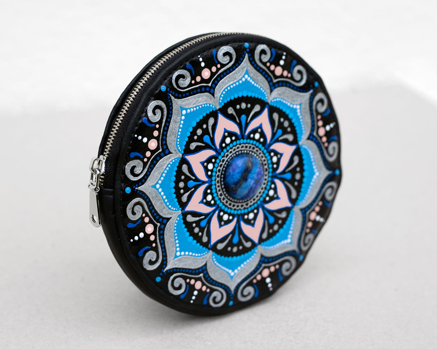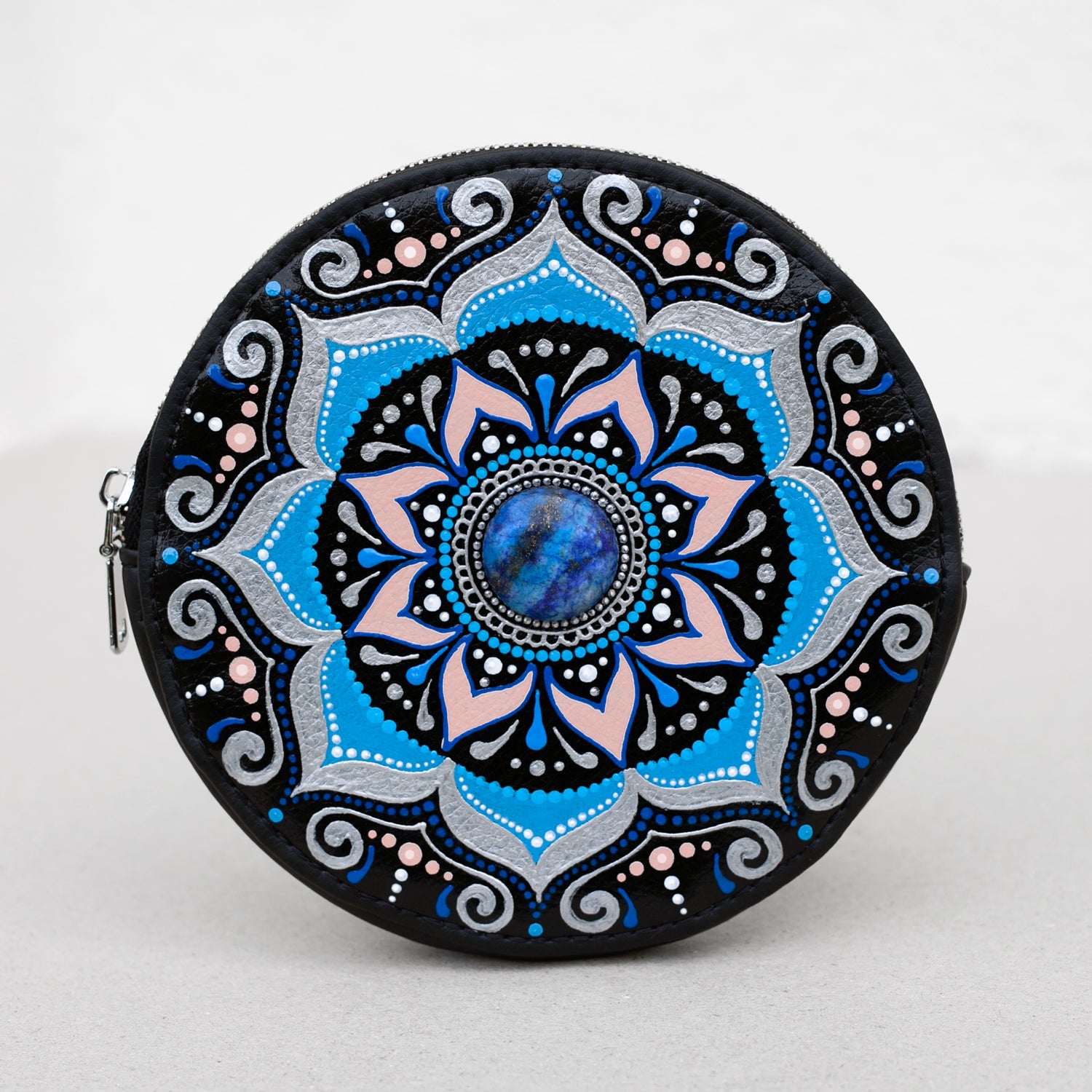 Ce portefeuille rond est fabriqué en similicuir vegan de première qualité. Il est orné d'un mandala peint à la main en bleu et rose avec une incrustation de pierre lapis-lazuli.