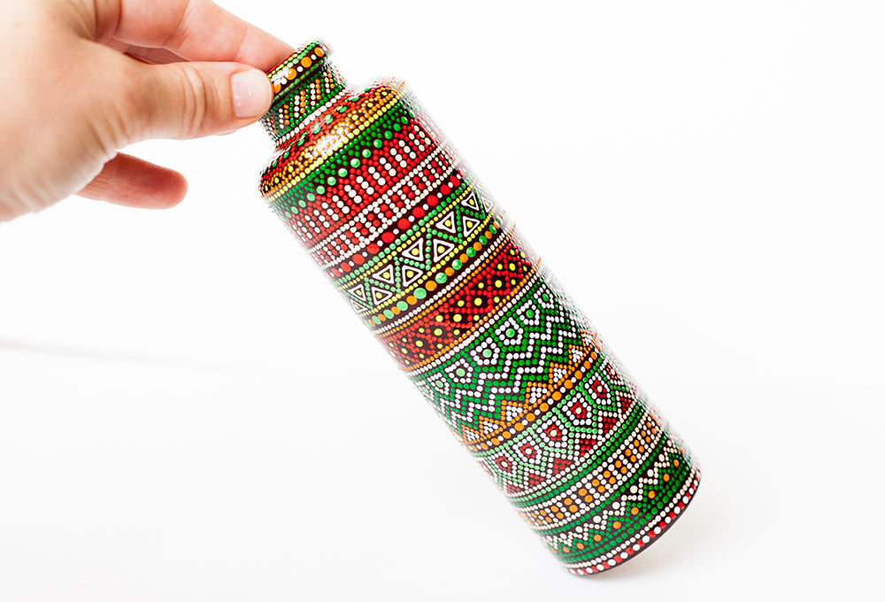 Explore the essence of African vibrancy in this collection, where bright and colorful motifs come to life through a dynamic interplay of lines, dots, and repeating geometric patterns. Each bottle unfolds a vivid story through its captivating design, inviting you to appreciate the rich tapestry of African artistry.