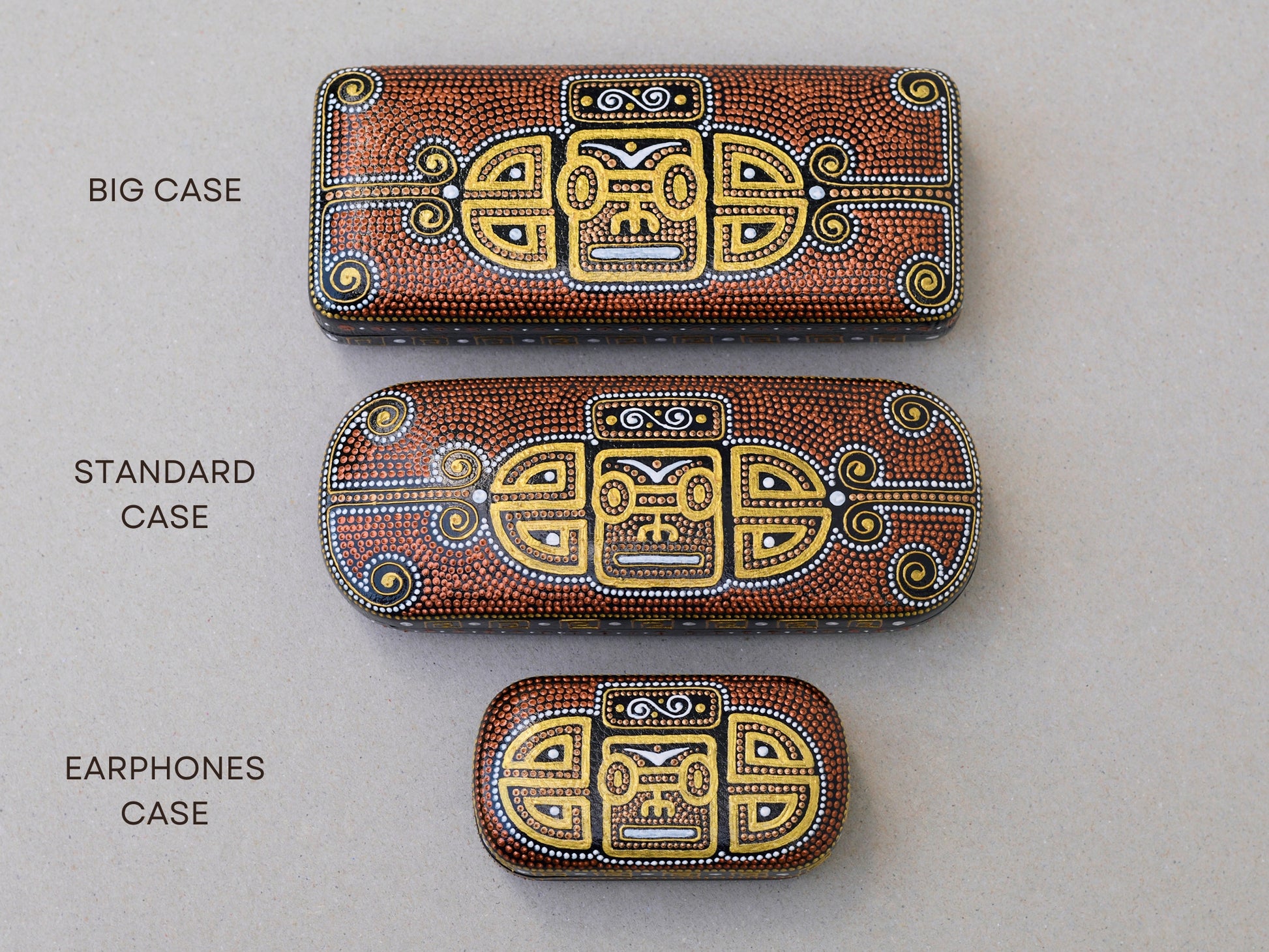 This hard shell glasses case is hand-painted with traditional Mayan design. Cases are made from sleek black PU leather and reinforced with a thin metal plate for added durability. It provides comprehensive protection for your eyeglasses against scratches, dust, and wear and tear.