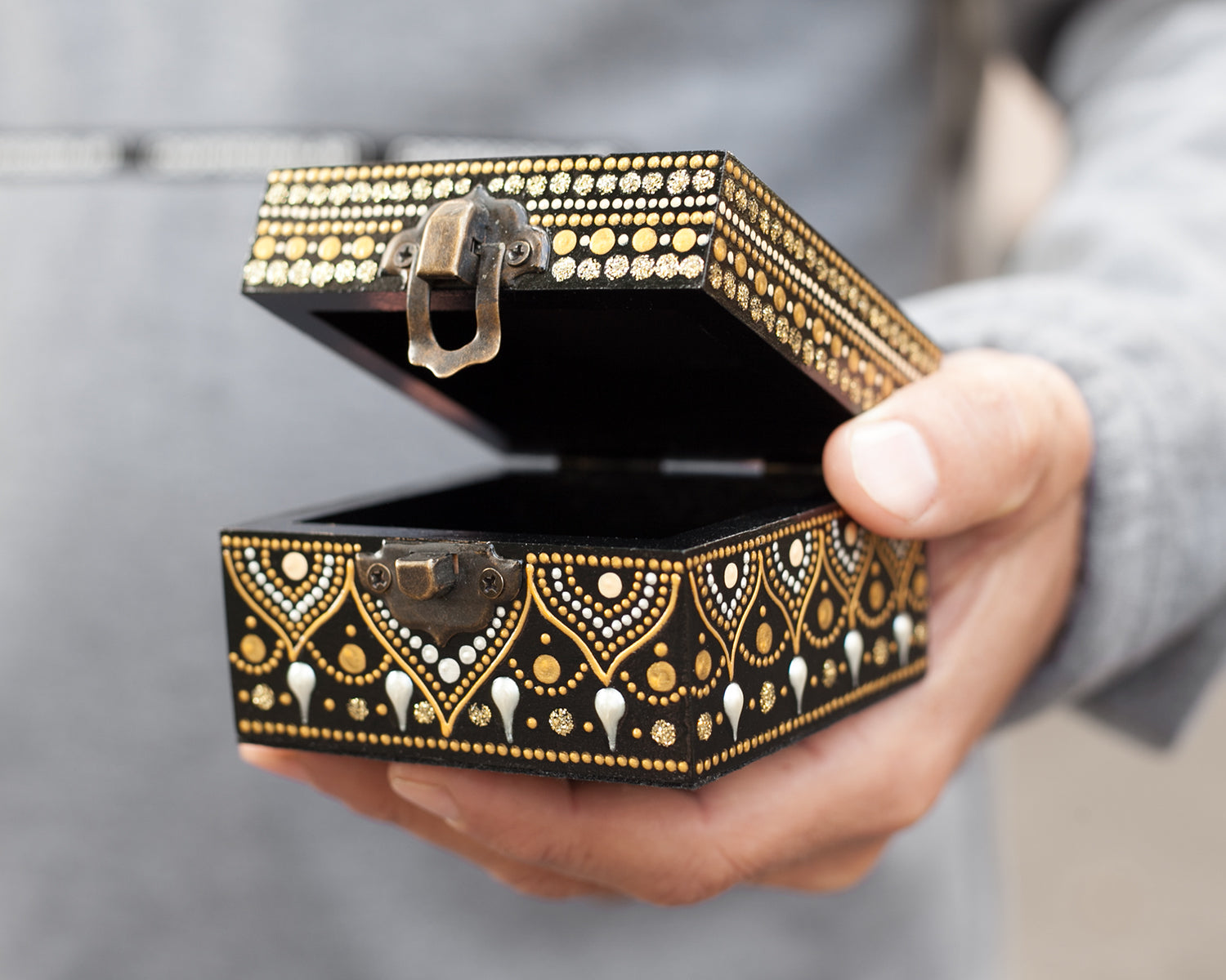 The box can be personalized by painting initials, names, or phrase to make it uniquely personal. It will be added under the lid. If you select to add personalization please write your text in "Order special instructions" at checkout.