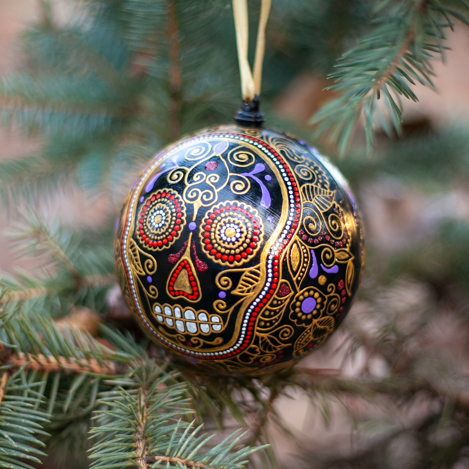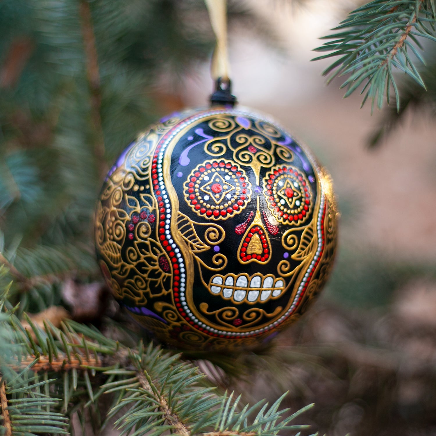 Add a touch of quirk to your holiday decorations with this Sugar Skull Bauble. Hand-painted with red and gold details on both sides, this versatile ornament can add some festive fun to your Christmas tree or spook up your Halloween decor.