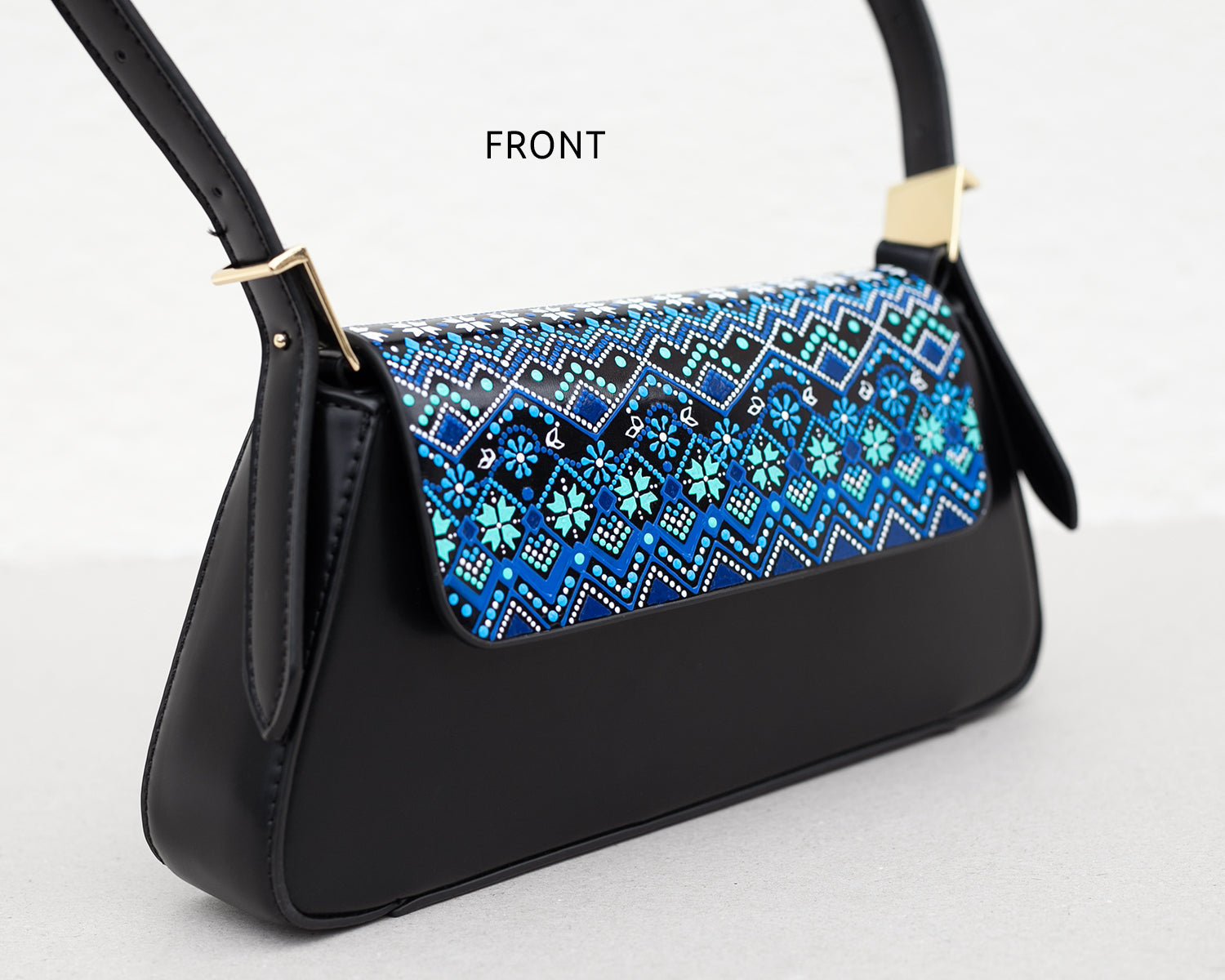 This elegant small black bag features hand-painted pattern in Ukrainian folk style, adorned with intricate and sophisticated details. Whether you're at a restaurant, a theater, or a romantic stroll, this handbag will not only hold your items but also enhance your outfit, making it a conversation starter and an emblem of style.