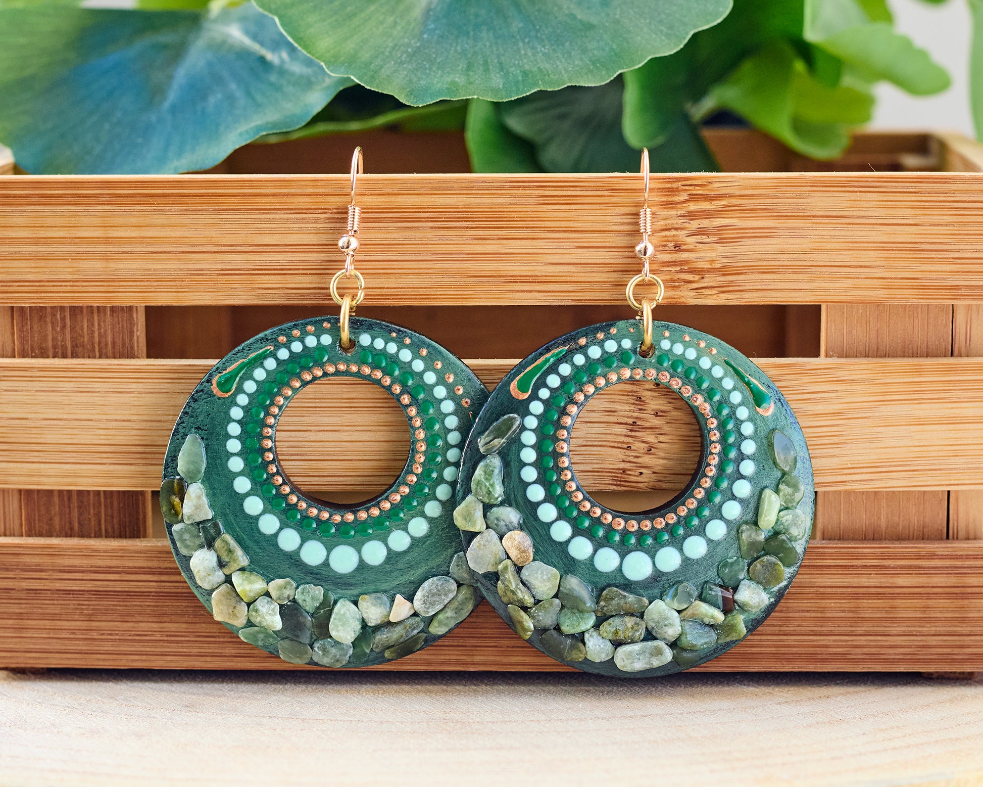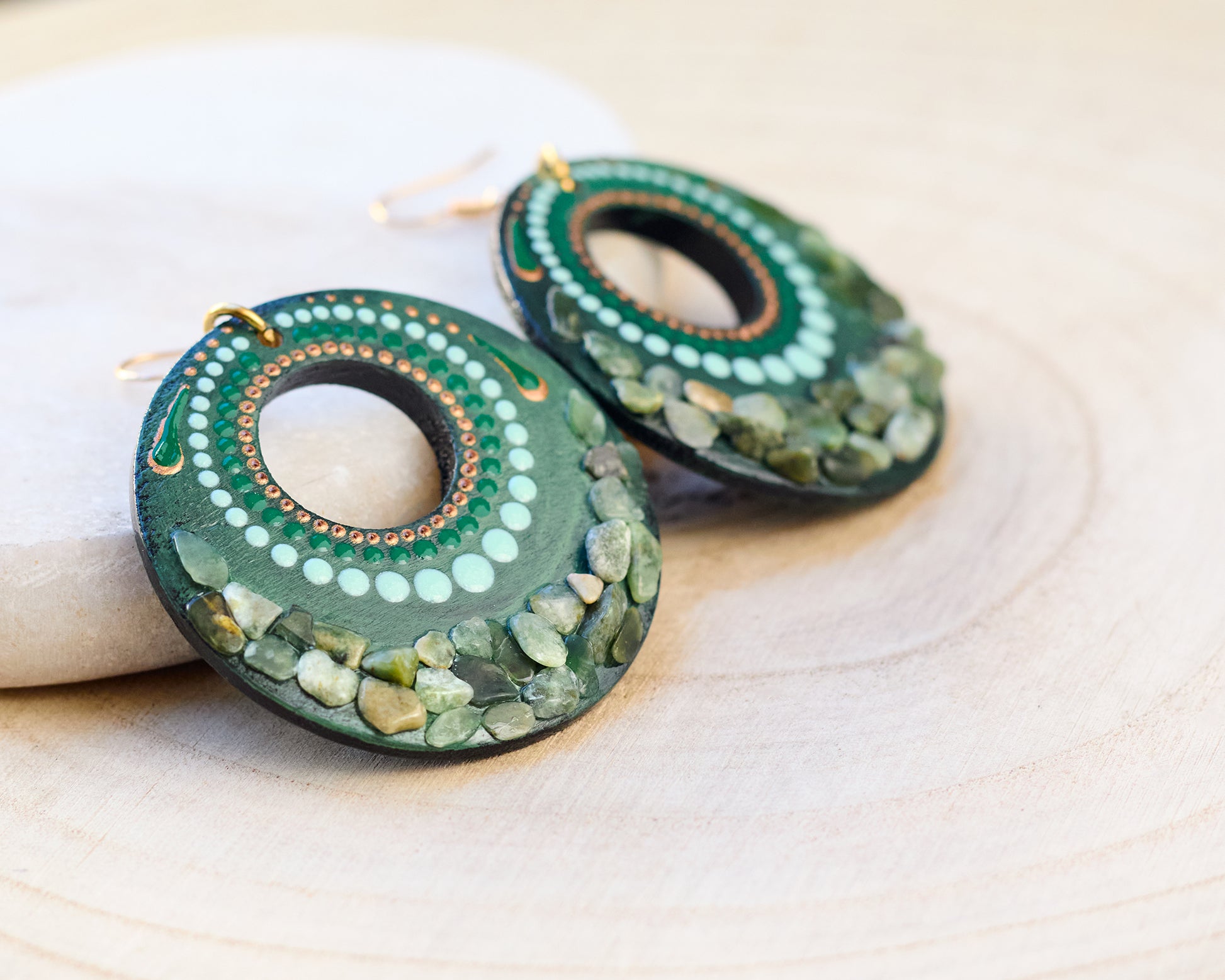 Wooden painted earrings featuring a natural stone inlay combined with hand-painted detailing. Lightweight and stylish, they add a unique handcrafted detail to daily wear.
