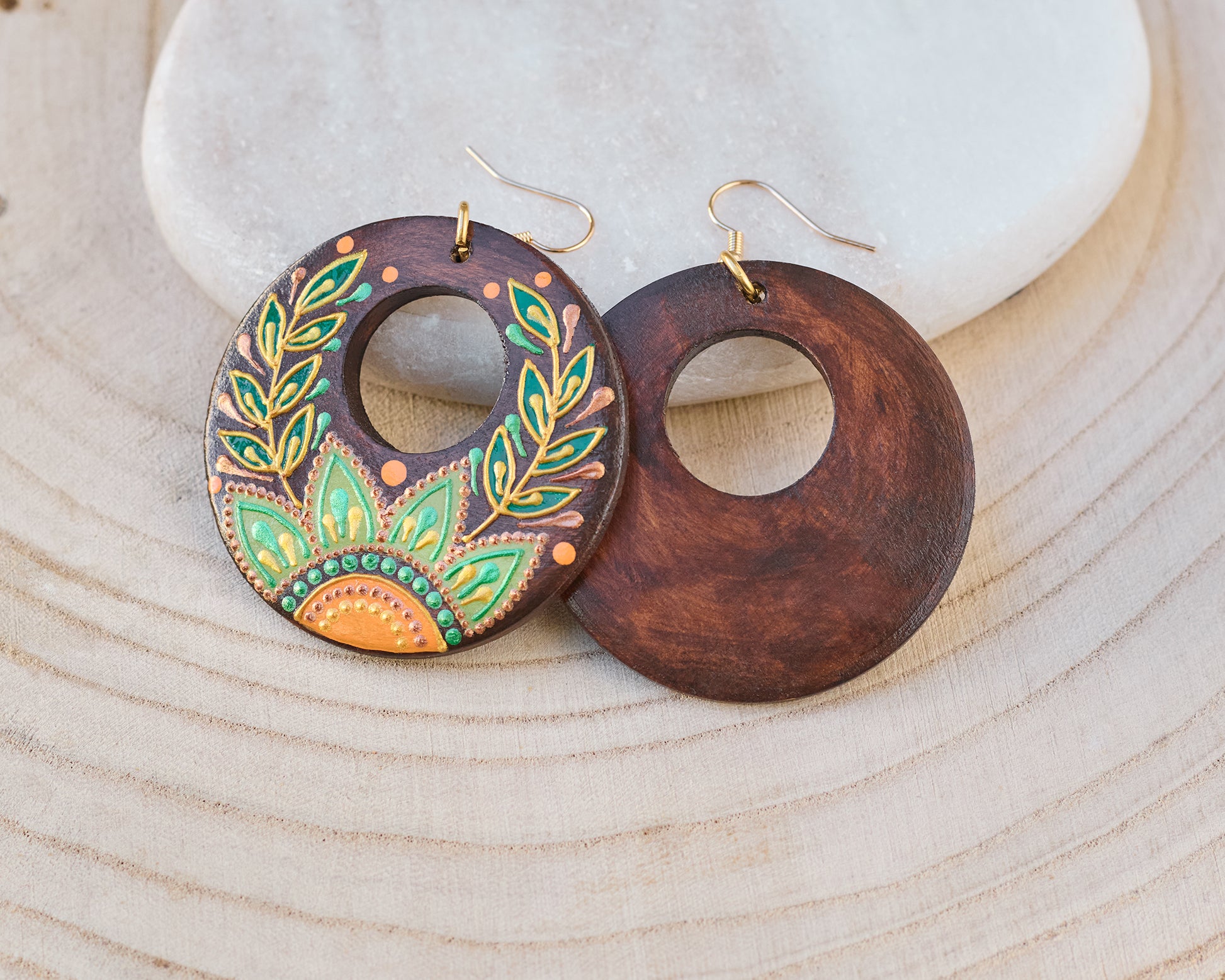 Wooden painted earrings inspired by nature and flowers. Lightweight and organic, they bring a subtle touch of natural warmth and artisanal charm to everyday wear.